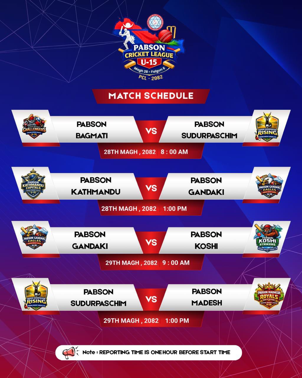 सुदूरपश्चिम प्रदेशले माघ २८ गते बाग्मती प्रदेशसँग खेल्दै प्रतियोगीताको सुरुवात गर्नेछ । त्यस्तै माघ २९ गते मधेश प्रदेश र फाल्गुन ४ गते कर्णाली प्रदेशसँग प्रतिस्पर्धा गर्नेछ ।