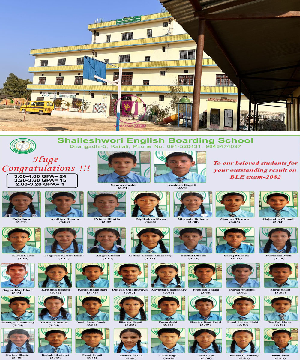 धनगढी ५ जाइँमा रहेको शैलेश्वरी ईङ्लिस बोर्डिङ्ग स्कुलका सौरभ जोशी र आशिष बोगटीले आधारभुत तहको वार्षिक परीक्षामा सर्वात्कृष्ट जिपिए प्राप्त गरेका छन । उत्तिर्ण ४० जना विद्यार्थी मध्ये सौरभ जोशी र आशिष बोगटीले ३.९४ जिपिए प्राप्त गरेका हुन । त्यस्तै समग्रतामा ३.६ देखि ४.०० जिपिएसम्म २४ जना,३.२ देखि ३.६० जिपिएसम्म १५ जना र २.८ देखि ३.२० जिपिएसम्म १ जना गरी जम्मा ४० जना विद्यार्थी उत्तिर्ण भएको विद्यालय प्रशासनले जनाएको छ ।