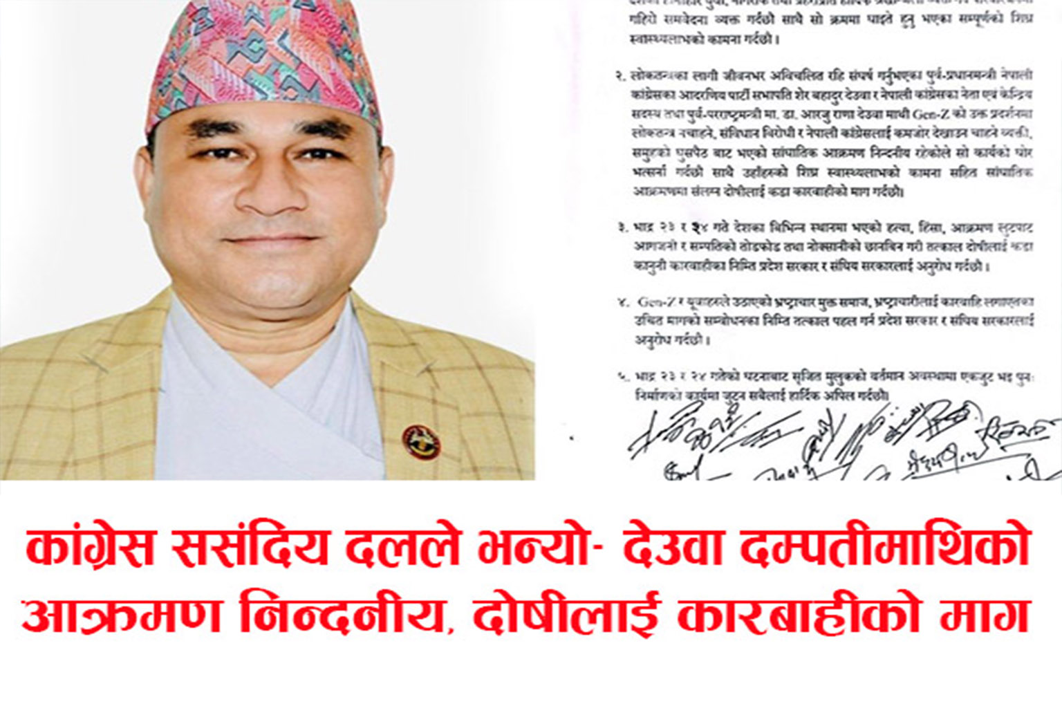 यस्तै बैठकले पार्टी सभापति शेरबहादुर देउवा र पूर्वपरराष्ट्रमन्त्री डा। आरजु राणा देउवामाथि भएको आक्रमणको घोर भर्त्सना गरेको छ। बैठकपछि जारी विज्ञप्तिमा भनिएको छ,लोकतन्त्रका लागि जीवनभर अविचलित रही संघर्ष गर्नुभएका पूर्वप्रधानमन्त्री तथा नेपाली कांग्रेसका आदरणीय पार्टी सभापति शेरबहादुर देउवा र नेपाली कांग्रेसका नेता एवं केन्द्रीय सदस्य तथा पूर्वपरराष्ट्रमन्त्री डा. आरजु राणा देउवामाथि जेनजीको उक्त प्रदर्शनमा लोकतन्त्र नचाहने, संविधान विरोधी र नेपाली कांग्रेसलाई कमजोर देखाउन चाहने व्यक्ति, समूहको घुसपैठबाट भएको साङ्घातिक आक्रमण निन्दनीय रहेकोले सो कार्यको घोर भर्त्सना गर्दछौँ साथै उहाँहरूको शीघ्र स्वास्थ्यलाभको कामनासहित साङ्घातिक आक्रमणमा संलग्न दोषीलाई कडा कारबाहीको माग गर्दछौँ।ʼ