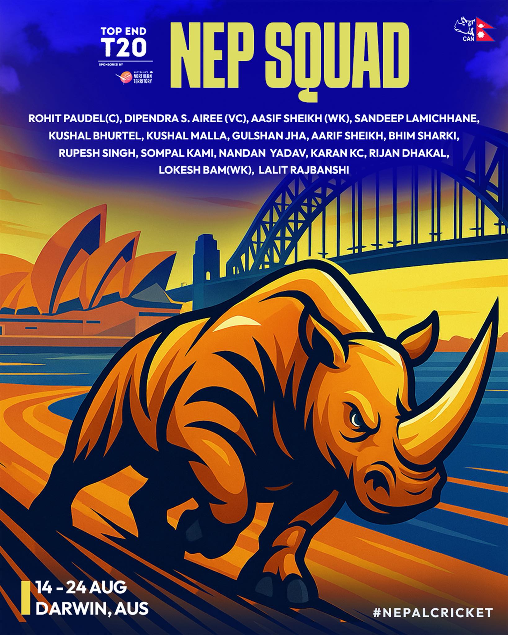 १९ श्रावण,२०८२ : यहि आउँदो अगस्ट १४ देखि २४ सम्म अस्ट्रेलियाको डार्विनमा आयोजना हुने टप एण्ड टी–२० सिरिजका लागि नेपाली राष्ट्रिय क्रिकेट टोलीको घोषणा गरिएको छ। नेपाल क्रिकेट संघ क्यानले सोमबार सामाजिक सञ्जाल मार्फत टोली घोषणा बारे जानकारी गराएको हो ।