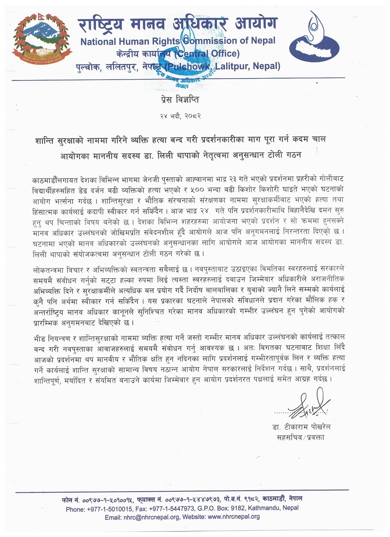 आयोगका प्रवक्ता डा. टीकाराम पौडेलले आज विज्ञप्ति निकालेर ’जेन जी’ पुस्ताले आह्वान गरेको हिजोको प्रदर्शनमा प्रहरीले अत्यधिक बल प्रयोग गरी व्यक्ति हत्या गरेको घटनाप्रति गम्भीर ध्यानाकर्षण गराउँदै शान्ति सुरक्षाको नाममा व्यक्ति हत्या कुनै पनि हालतमा स्वीकार्य नहुने स्पष्ट गरेको छ ।