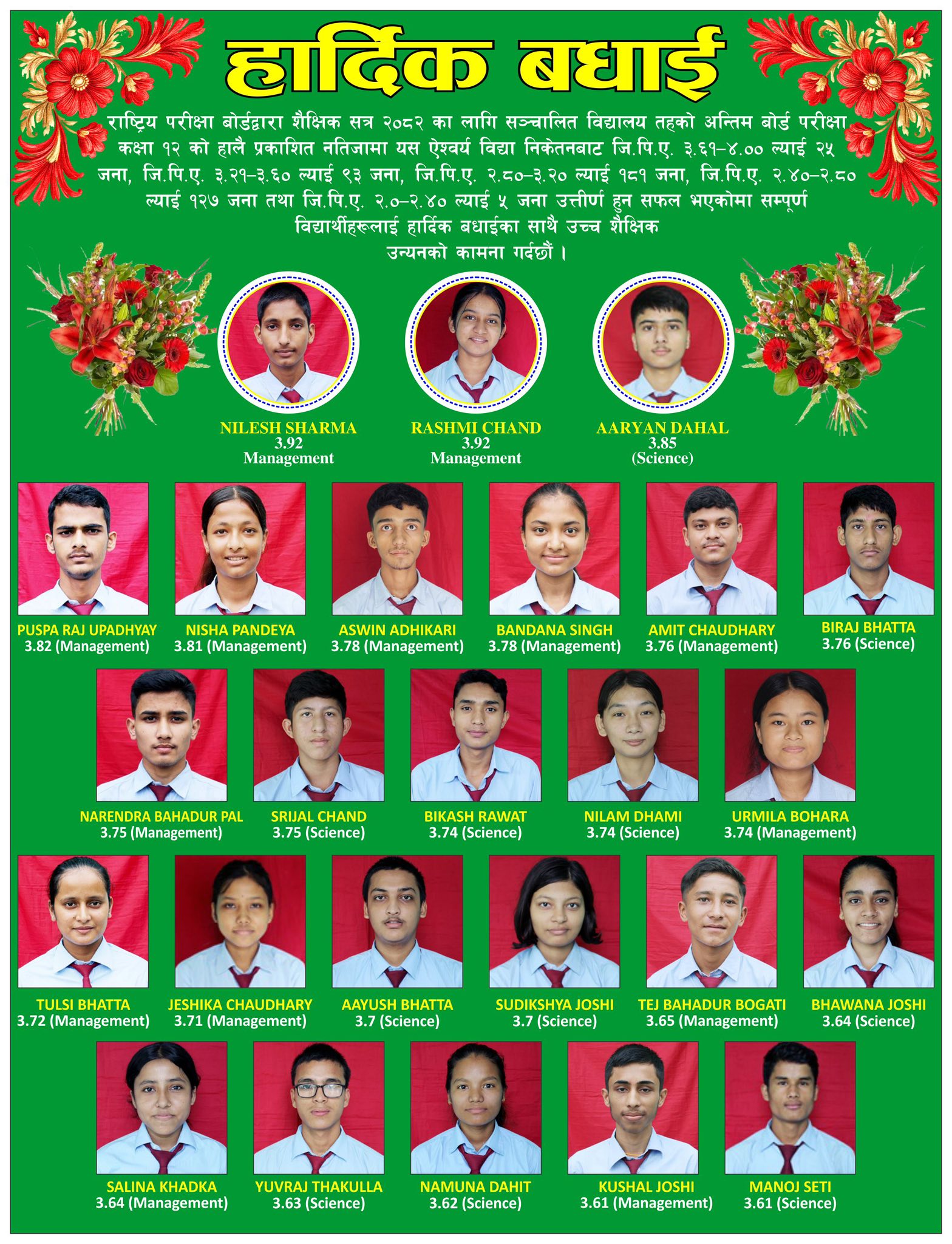 २० श्रावण,२०८२: धनगढी उपमहानगरपालिका वडा न.५ मा हसनपुरमा रहेको ऐश्वर्य विद्या निकेतनले कक्षा १२ मा ५७.७७ प्रतिशत नतिजा ल्याएको छ । राष्ट्रिय परीक्षा बोर्डले सोमबार सार्वजनिक गरेको नतिजा अनुसार २०८१ कोे कक्षा १२ को वार्षिक परीक्षामा सहभागी ७४६ जना विद्यार्थी मध्येमा ४३१ जना उत्तिर्ण भएको विद्यालय प्रशासनले जनाएको छ । उत्तिर्ण ४३१ विद्यार्थी मध्ये व्यवस्थापन संकायका निलेश शर्मा र रश्मी चन्दले सर्वोत्कृष्ट नतिजा ल्याउन सफल भएका छन । उनीहरु दुवैले ३.९२ जिपिए प्राप्त गरेका छन ।