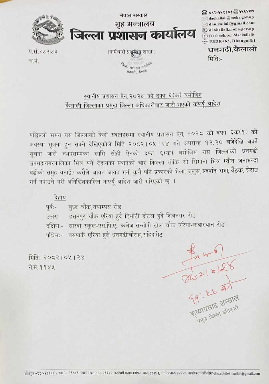 जिल्ला प्रशासन कार्यालय, कैलालीका प्रमुख जिल्ला अधिकारी कृषणप्रसाद भुसालले २०८२ भदौ २४ गते अपराह्न १२ः१० बजेदेखि अर्को आदेश जारी नभएसम्मको लागि निषेधाज्ञा लागू हुनेगरी आदेश जारी गरेका हुन्।