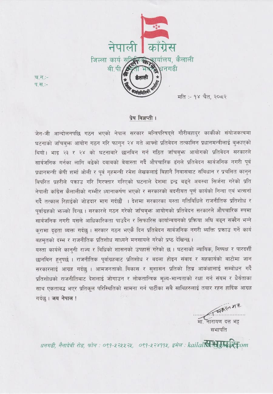 कांग्रेस कैलालीले घटनाको न्यायिक, निष्पक्ष र पारदर्शी छानबिन हुनुपर्नेमा जोड दिँदै प्रतिशोधको राजनीति त्यागेर संवाद र सहकार्यको बाटोमा अघि बढ्न सरकारलाई आग्रह गरेको छ ।