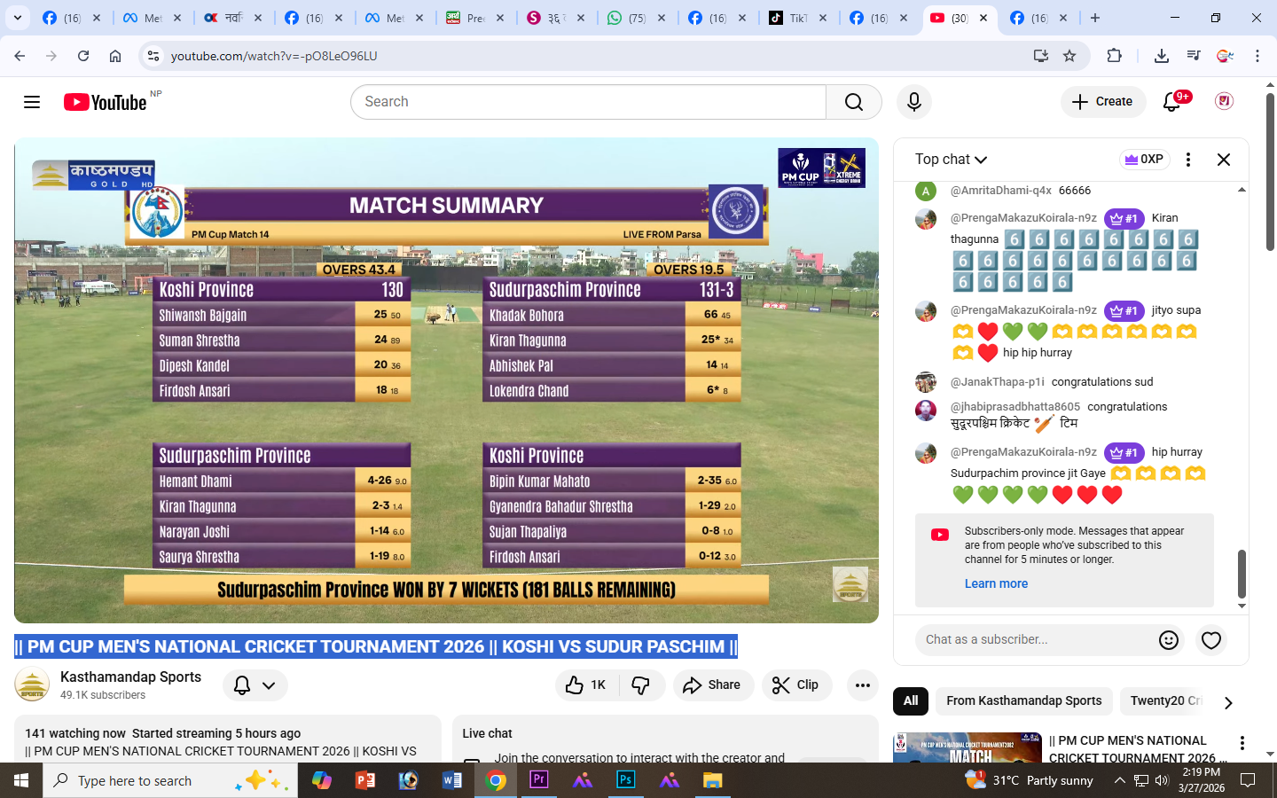 सुदूरपश्चिमले कोशी प्रदेश विरुद्ध ७ विकेटको सहज जित दर्ता गरेको छ। कोशीले दिएको १३१ रनको लक्ष्य सुदूरपश्चिमले १९.५ ओभरमै भेटायो। सुदूरपश्चिमका लागि खडक बोहराले ६६ रनको उत्कृष्ट पारी खेले ।