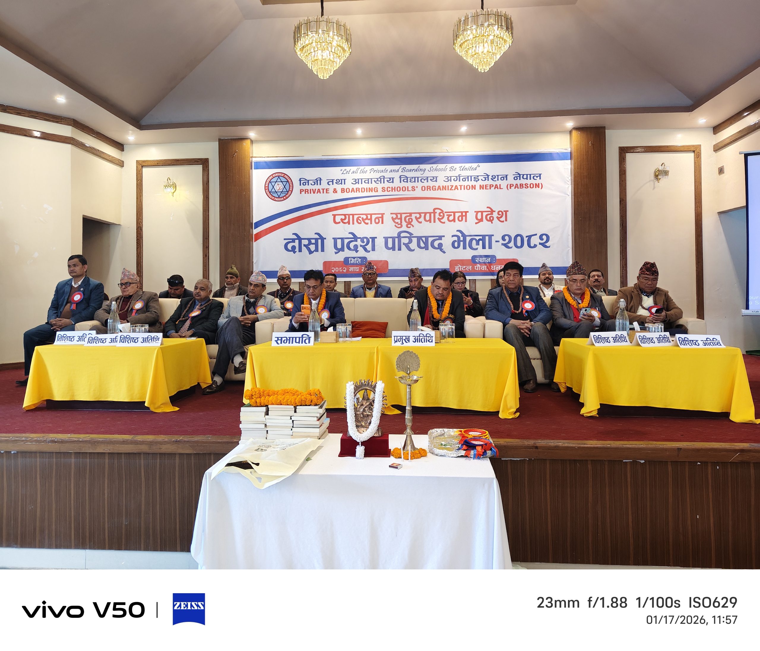नीजि तथा आवासिय विद्यालय अर्गनाइजेशन नेपाल सुदूरपश्चिम प्रदेश समितिको दोश्रो प्रदेश परिषद भेला सम्पन्न भएको छ । सनिबार धनगढीको होटेल पौवामा एक भव्य कार्यक्रमका बीच प्याब्सन सुदूरपश्चिम प्रदेश समितिका अध्यक्ष सिबी चन्दको अध्यक्षतामा सम्पन्न उक्त परिषद भेलाको प्रमुख अतिथि नीजि तथा आवासिय विद्यालय अर्गनाइजेशन नेपाल ( प्याब्सन ) का अध्यक्ष कृष्ण प्रसाद अधिकारी रहेका थिए ।