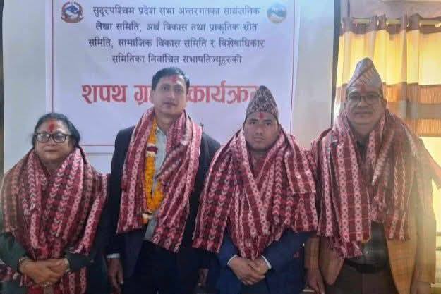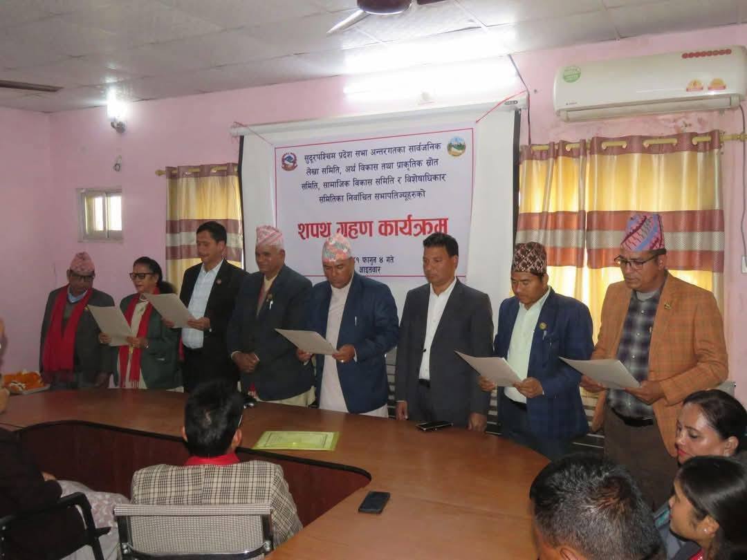 सार्वजनिक लेखा समितिको सभापतिमा नेकपा माओवादी केन्द्रका अक्कलबहादुर रावल, सामाजिक विकास समितिको सभापतिमा नेकपा एमालेका धर्मराज पाठक, अर्थ विकास तथा प्राकृतिक स्रोत समितिको सभापतिमा नागरिक उन्मुक्ति पार्टीका घनश्याम चौधरी र विशेषाधिकार समितिको सभापतिमा नेपाली काँग्रेसका तुल्सी देवकोटाले शपथग्रहण गरेका छन् । गत पुस ११ मा सत्तारूढ दल नेपाली काँग्रेस र नेकपा एमालेबीच विषयगत समितिको सभापतिमा भागबन्डा भएको थियो । उक्त भागबन्डाका आधारमा नागरिक उन्मुक्ति पार्टीले अर्थ विकास तथा प्राकृतिक स्रोत विकास समिति, एमालेले सामाजिक विकास समिति, प्रमुख प्रतिपक्षी दल नेकपा माओवादी केन्द्रले सार्वजनिक लेखा समिति पाउने सहमति भएको हो ।