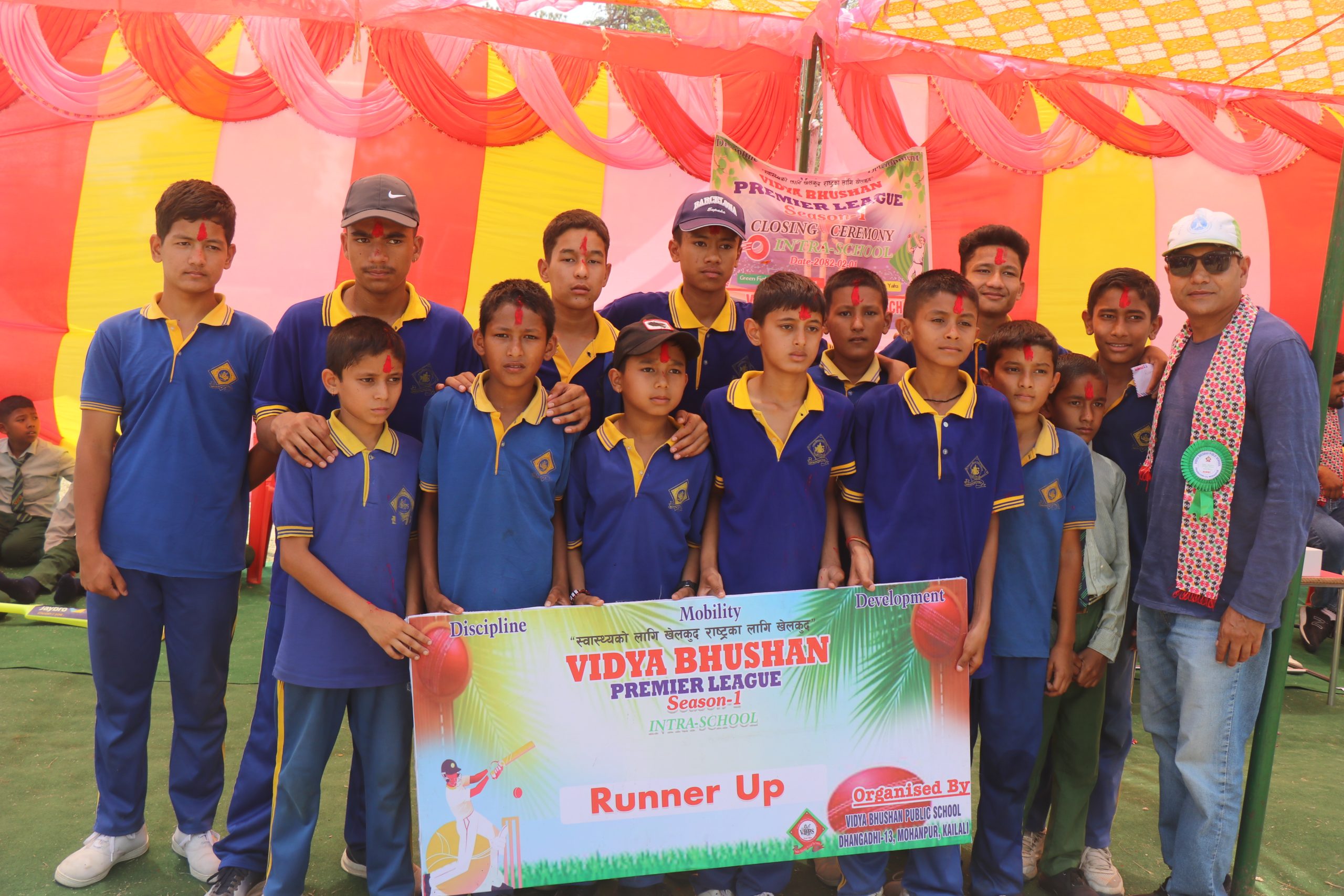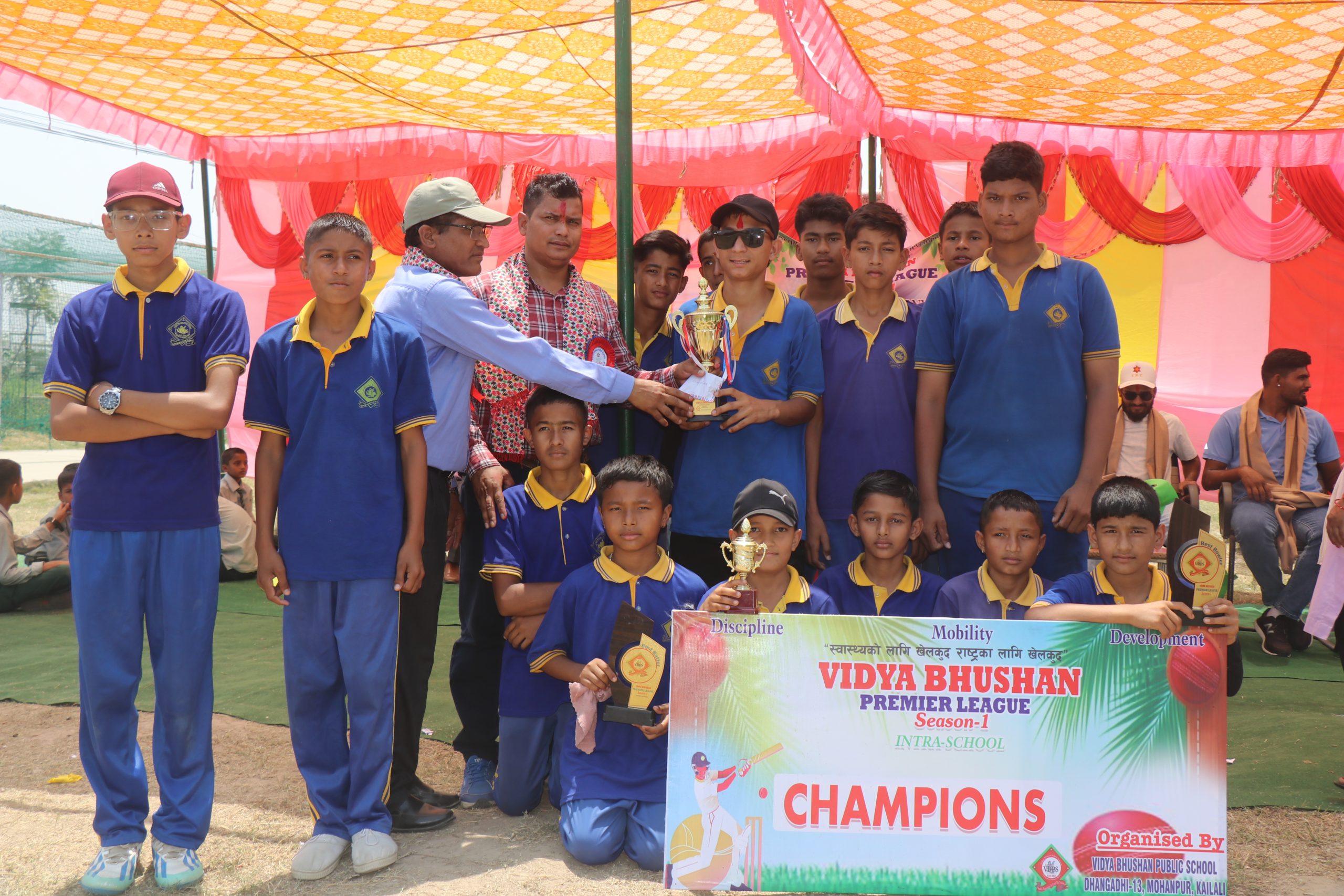 धनगढी उपमहानगरपालिका वडा न १३ गेटामा रहेको विद्या भुषण पब्लिक स्कुलको आयोजनामा सम्पन्न विद्या भुषण प्रिमियर लिग (VBPL ) इन्ट्रा स्कुल क्रिकेट प्रतियोगीताको फाइनल खेलमा ग्रीन फाइर्टसका कप्तान विवेक दुवालले टस जितेर पहिला फिल्डिङ गर्ने निर्णय गरेका थिए । टस हारेर पहिला ब्याटिङ गरेको यलो याक्सले निर्धारित १२ ओभरको खेलमा अलआउट हुँदै ५८ रन जोड्न सफल भयो ।